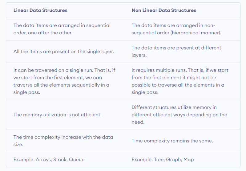 Now that we know about linear and non-linear data structures, let's see the major differences between them.